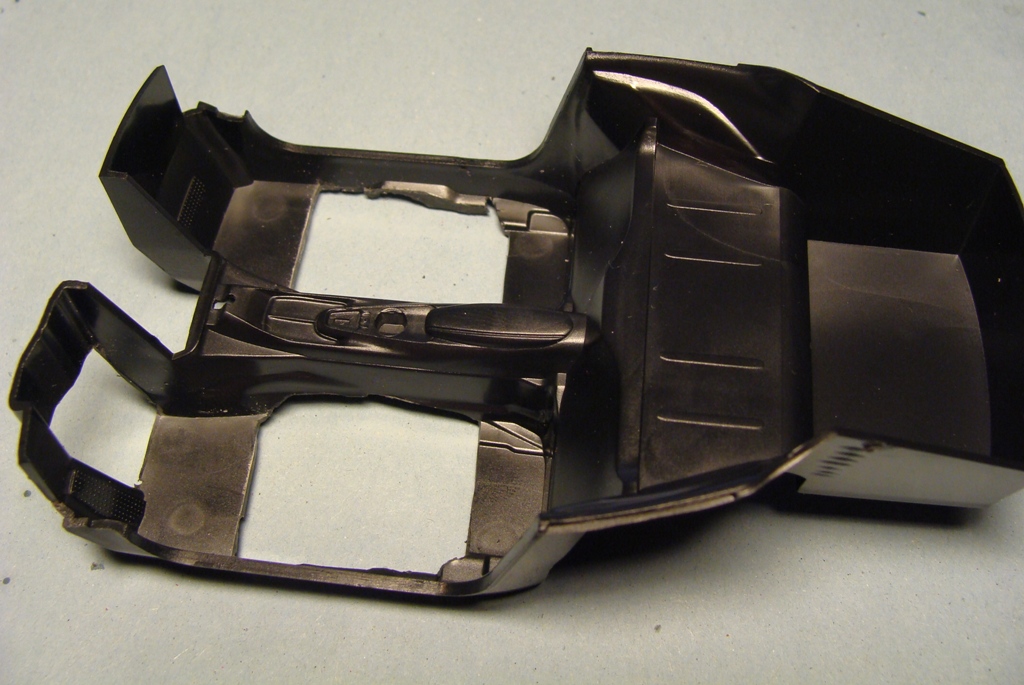Zas nějakej postup. Ztenčil jsem hrubost plastu okolo zadních mřížek pod výfuky, udělal jsem tam takový zaškrábání, aby sedla síťka perfekt. Až když jsem to dloubal mi došlo, že budu muset nějak dodělat tlumiče co budou trochu vidět